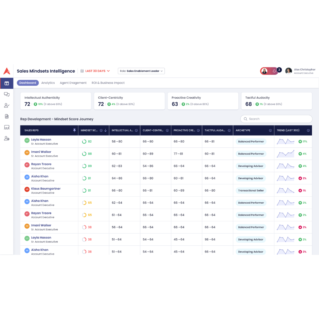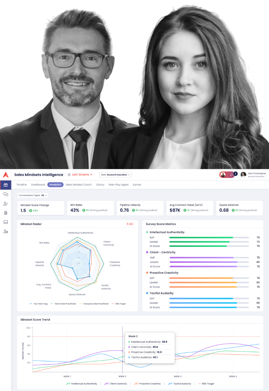 The Sales Mindsets Intelligence Studio is designed to close that gap. It uses Aviso's AI to draw consistent feedback from recorded customer conversations and provide quantifiable measurement for how well salespeople are selling on every call.
